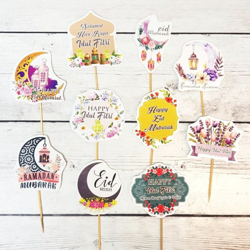 Cake Topper Idul Fitri Floral1 set isi 10 pcsTinggi ±6cmBahan Art Paper 260 gramSudah termasuk tu