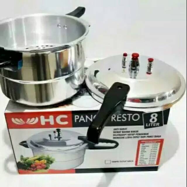 Panci presto Happycall 3 fungsi*Merebus*Mengukus*Tekanan/ presto-kapasitas 8 liter-material alumunium-aman & awet digunakan-Diameter 24 cm-mudah dibersihkan-Merk Happy call Dan HC itu Sama yaTergantung Stok KitaKapasitas 8 LPanci presto ini mampu menampung bahan masakan hingga 8 liter. Kapasitas besar ini membuat anda dapat memasak untuk seluruh keluarga tanpa kesulitan.Hemat Energi dan WaktuMemasak makanan dengan menggunakan pressure cooker dari Happycall dapat menghemat waktu memasak anda karena panci ini menggunakan prinsip tekanan udara yang tinggi sehingga masakan lebih cepat matang.Menjaga nutrisiTerbuat dari bahan alumunium berkualitas yang aman bagi makanan dan awet untuk digunakan dalam jangka panjang. panci presto ini dapat digunakan sebagai pelunak atau pengempuk daging, ayam dan bahan masakan lai