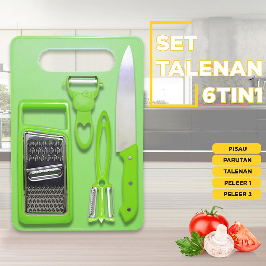 Set Talenan Dapur Lengkap Dengan Pisau Dan Peeler 5in11 Set Talenan Berisi :- 1Pcs Parutan- 1Pcs Pisau- 1Pcs Alat Kupas Buah- 1Pcs Peeler- 1Pcs TalenanSpesifikasi :Berat :Ukuran : 20cm*30cmBahan: Stainless Steel Dan PlastikPisau terbuat dari bahan stainless steel sehingga aman untuk bahan makanan dan lebih tajam. Talenan terbuat dari bahan plastik ABS yang berkualitas dan tidak licin.Untuk menjaga pisau tetap tajam dan lebih lama digunakan, sehabis memotong bahan makanan disarankan membersihkan menggunakan air panas dan kain