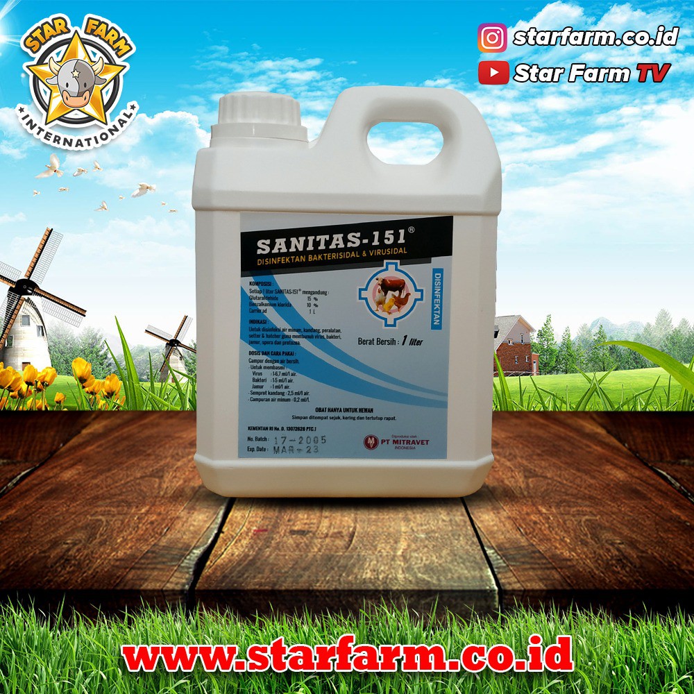 Gunakan SANITAS-151 sebanyak 1-6.7 ml/L untuk membasmi virus, 1-5 ml/L untuk membasmi bakteri, 1 ml/L untuk membasmi jamur, 2.5 ml/L untuk semprot kandang, dan 0.2 ml/L untuk campuran air minum. SANITAS-151 ® sudah teregistrasi di Kementrian Pertanian dengan Nomor Registrasi D. 13072626 PTC 1.Netto : 1lthttps://www.youtube.com/watch?v=3SRlEfJ3XEo&