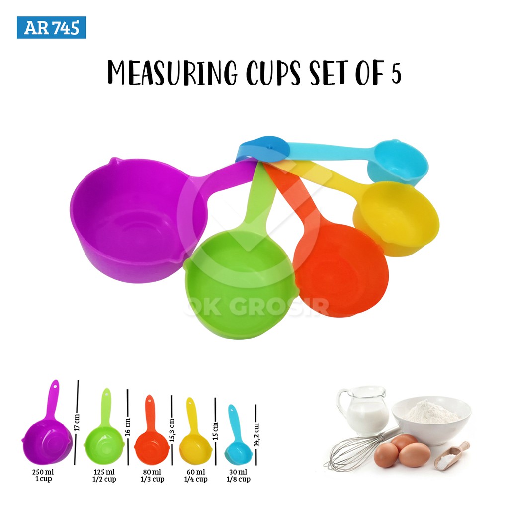 Measuring Cups / Sendok Takar [ Kode AR 745 ] Per 1 Set 5 PcsInformasi Produk : - 1 set isi 5 cup sendok takar- Bahan plastik tebalSpesifikasi :1. 1/8 cup = 30 ml2. 1/4 cup = 60 ml3. 1/3 cup = 80 ml4. 1/2 cup = 125 ml5. 1 cup = 250 mlKegunaanya : Sendok mengukur adalah sendok yang digunakan untuk mengukur jumlah dari bahan , baik cair atau kering, saat memasak#sendoktakar #takaran #sendok #cup #measuring #measuringcups #okgr