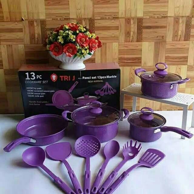 Panci Set 13 Pcs Cookware Tri J Terdiri dari- Milkpan + tutup kaca diameter 16 cm- Saucepan + Tutup kaca diameter 22 cm- Saucepan +Tutup kaca diameter 18 cm- Frypan 22 cm- 6 pcs Spatulaready lagiiii ungu,merah,coklat..hijau habis*kita tdk mengirim random,jadi jika pilihan yg di minati habis akan kita chat n bisa ajukan pembatalan ya ,karena kepuasan pelanggan adl pentinghappy shop