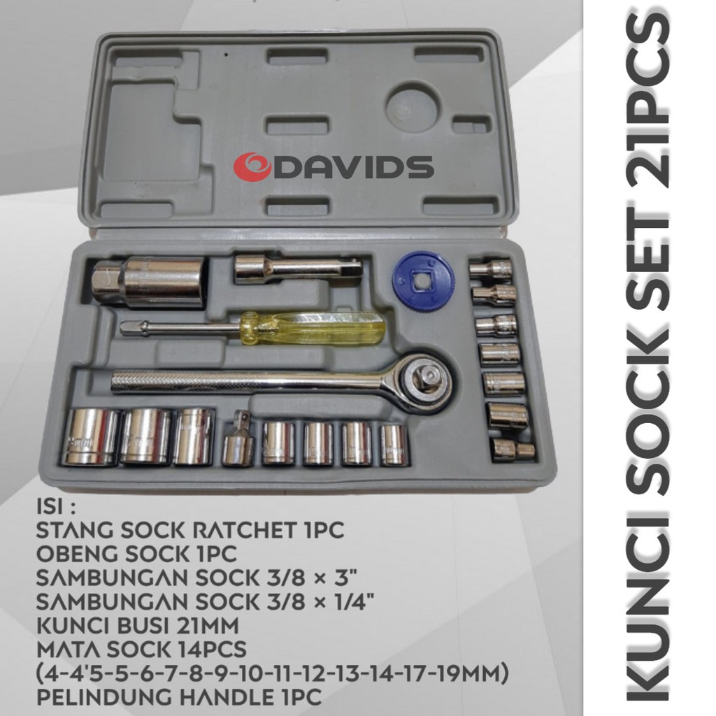 Kelengkapan Produk :- 1 buah gagang sok ratchet 3/8"- 1 buah obeng sok 1/4"- 1 buah sambungan sok 3/8" panjang 3"- 1 buah sambungan sok 3/8" x 1/4"- 1 buah kunci busi 21 mm- 1 buah mata sok 1/4" ukuran 4 mm- 1 buah mata sok 1/4" ukuran 4,5 mm- 1 buah mata sok 1/4" ukuran 5 mm- 1 buah mata sok 1/4" ukuran 6 mm- 1 buah mata sok 1/4" ukuran 7 mm- 1 buah mata sok 1/4" ukuran 8 mm- 1 buah mata sok 1/4" ukuran 9 mm- 1 buah mata sok 1/4" ukuran 10 mm- 1 buah mata sok 1/4" ukuran 11 mm- 1 buah mata sok 1/4" ukuran 12 mm- 1 buah mata sok 1/4" ukuran 13 mm- 1 buah mata sok 3/8" ukuran 14 mm- 1 buah mata sok 3/8" ukuran 17 mm- 1 buah mata sok 3/8" ukuran 19 mm- 1 buah pelindung handle- Dilengkapi packing box plastik#kuncishock #kuncishockset #kuncisok #kuncisokset #too