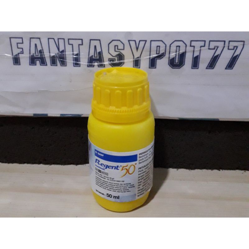 Insektisida dan zat pengatur tumbuh merk Regentbahan aktif fipronil 50 g/linsektisida sistemik racun kontak, lambung dan zat pengatur tumbuh tanaman berbentuk pekatan suspensi berwarna putih untuk mengendalikan hama dan tanaman kubis, cabai, kentang, padi, semangka, jagung, tebu, kakao, kelapa sawit, kacang panjang, jeruk dan kedelai.isi 50mlPeringatan :berbahaya bagi kesehatan jika tertelan. jauhkan dari jangkauan anak anak.harga per 1 botol ya